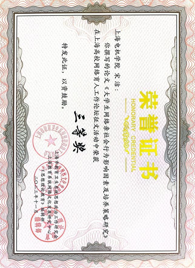 近日,欧冠官网宋洁老师在上海高校网络育人工作论坛征文中,以题为《大学生网络亲社会行为影响因素及培养策略研究》一文,喜获三等奖!