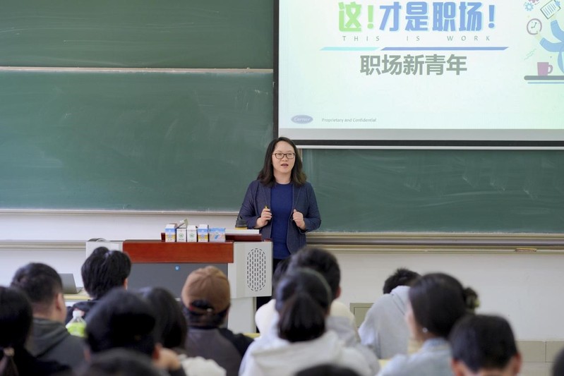 活动中,周可佳做了“职场新青年”的主旨演讲,结合自己职业发展成长的经历,以问题互动、故事盲盒等形式分享了对青年职业选择、职业素养、职业竞争力的看法以及开利的企业文化。她认为,大学期间要积累准备的基本素质包括学习、视野、实践、能力、敏捷度、意愿以及尊重、包容、诚信、创新、卓越的品质等。