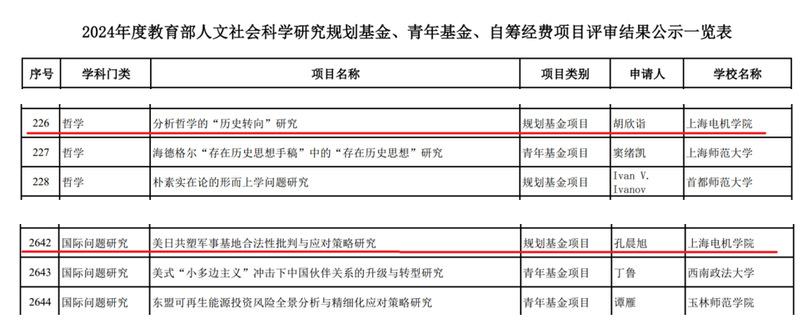 近日,教育部社科司公示2024年度教育部人文社会科学研究规划基金、青年基金、自筹经费项目的评审结果,欧冠官网胡欣诣、孔晨旭两位教师主持的“分析哲学的‘历史转向’研究”和“美日共塑军事基地合法性批判与应对策略研究”获批规划基金项目。