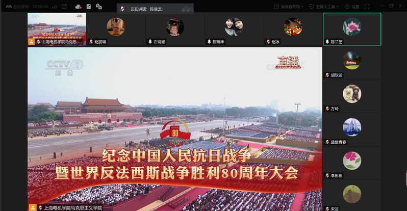 全体教师首先一起收看了纪念中国人民抗日战争暨世界反法西斯战争胜利80周年大会,学习习近平总书记在纪念大会上的重要讲话并全程观看了阅兵式。整齐划一的步伐,坚定自信的目光,高精尖的信息化装备,无不彰显着我国的国威与实力。老师们心潮澎湃,充满自豪,阅兵式后第一时间学习了习近平总书记在纪念中国人民抗日战争暨世界反法西斯战争胜利80周年大会上的重要讲话精神。学院党总支书记范冬姣主持会议。
